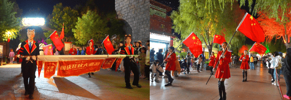 本次在原有花车巡游基础上,特别融入非遗傩戏元素。演员们佩戴精美傩面具,身着传统民族服饰,手持“国泰民安”“花好月圆”等主题手举牌与国旗,与游客亲切互动。这场融合传统与现代的巡游活动,既展现中华民族对美好生活的向往,也传递着家国同庆的双节祝福。