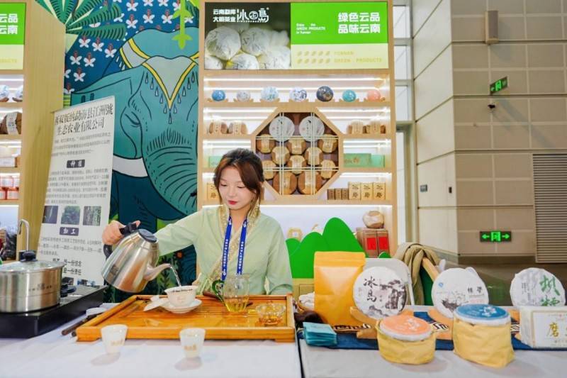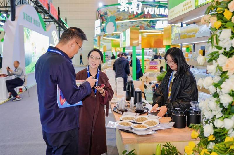本次云南展区突破传统陈列模式,打造“云茶空间”“云咖吧台”“云花场景”三大互动板块。在云茶空间,观众通过“观、闻、品、悟”沉浸式感受云南普洱茶、滇红茶、白茶和茉莉花茶的独特魅力;