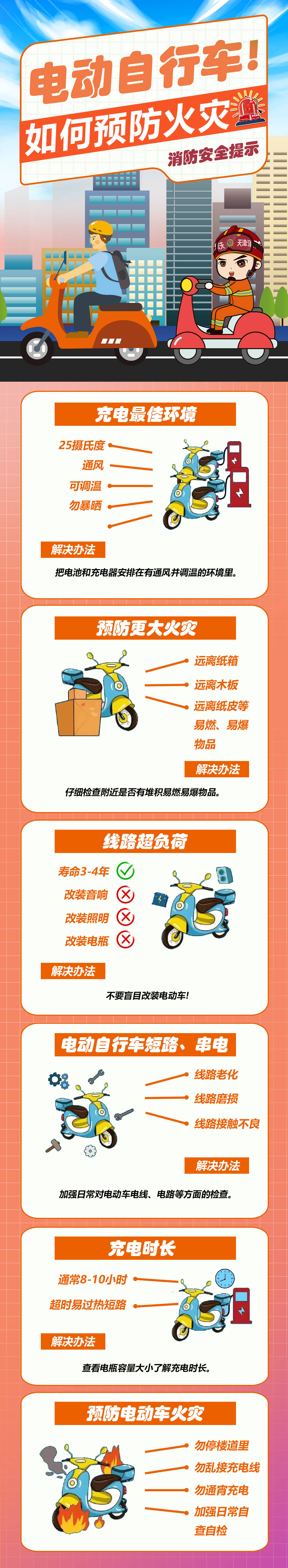 电动车不进楼、不飞线、不改装,室外充、有人看,充电不超过8小时!停车远离可燃物,楼道通畅生命线,异味冒烟快断电,隐患杜绝灭祸端。平安来自警惕,消防安全常挂心!